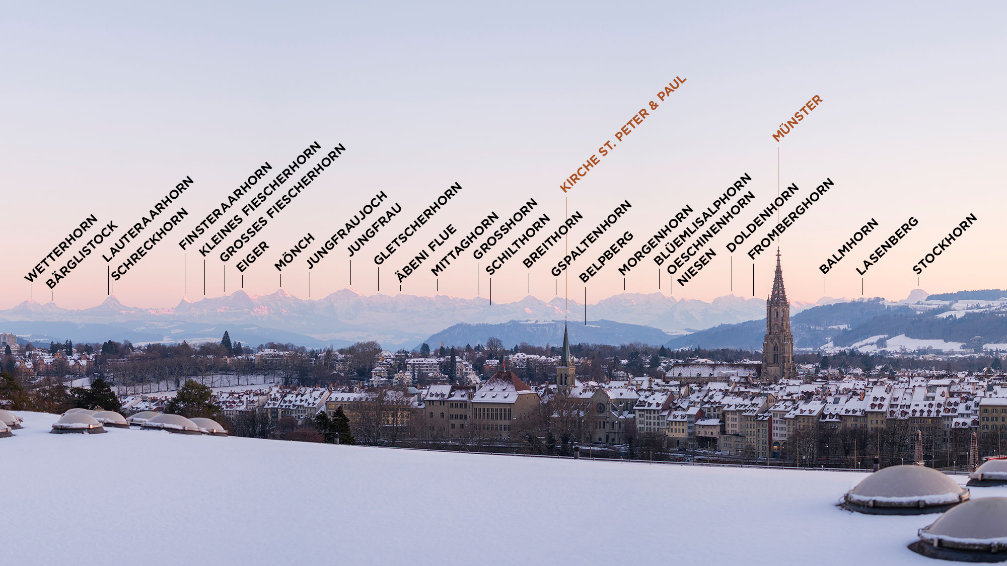 Dass das Rooftop eine einzigartige Aussicht auf Bern und die Berge bietet, ist unbestritten. Aber wie heissen sie nochmal, diese eindrücklichen schneebedeckten Gipfel?