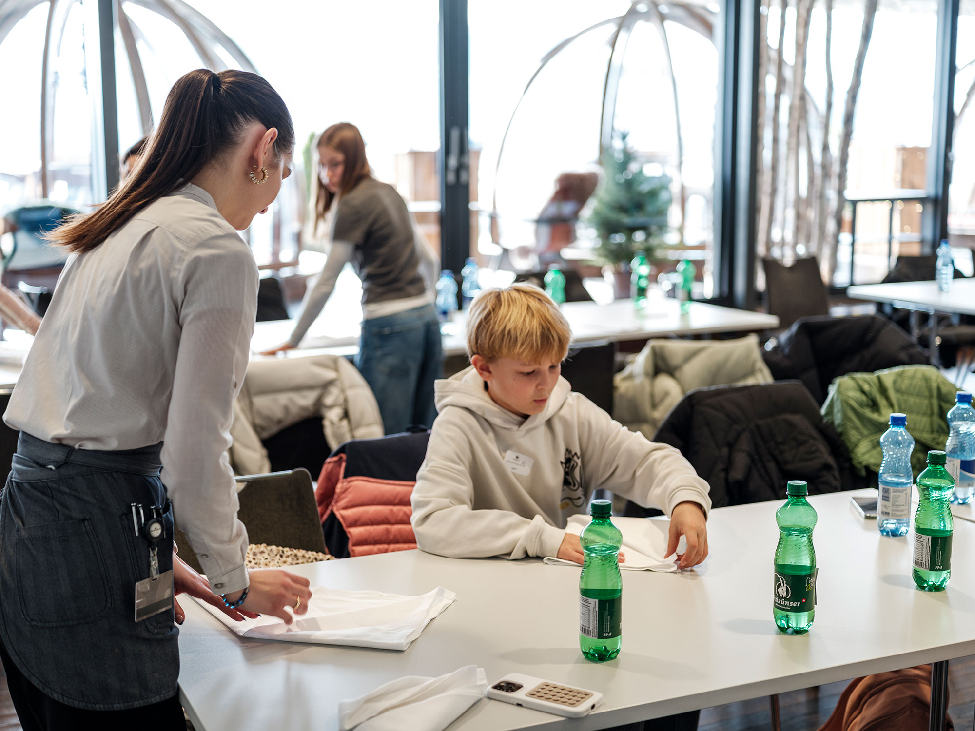 Selbst Hand anlegen war auch im Service gefragt. Fruchtige Mocktails mixen (und dann auch trinken) sowie Servietten fachgerecht falten – das waren die Aufgaben. Zu guter Letzt ging es in die Event-Abteilung: Hier konnten die Kinder und Jugendlichen ein Event ihrer Wahl planen: Vom Geburtstagsfest über einen Kongress bis hin zum Konzert war alles möglich. Was braucht es alles? Wie sollen die Tische stehen? Wann kommt das Essen? Welche Technik ist nötig? Da wurde diskutiert und geplant.
